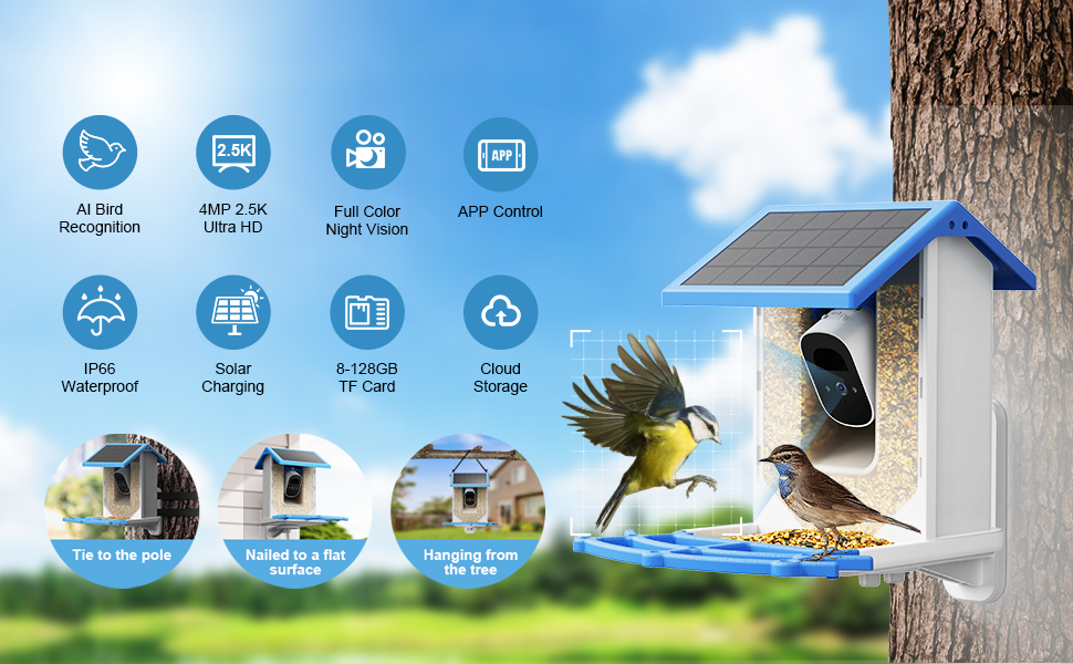 2/ The smart bird feeder supports multiple installation methods, including rope suspension, screwdriver installation, and strap fixation