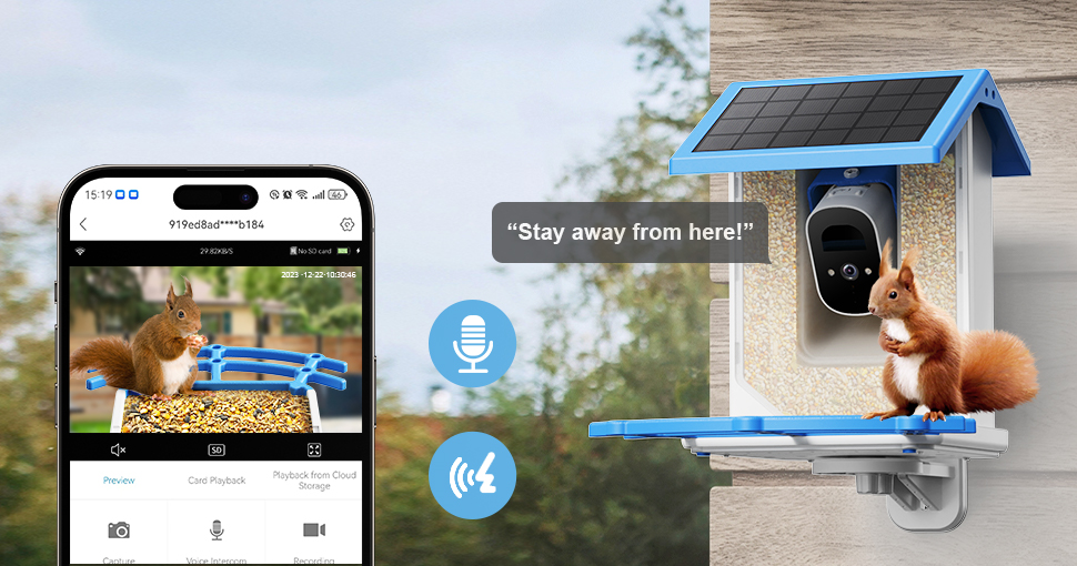 2/ Wireless control of bird feeder camera on mobile phone, supporting shouting, drive away squirrels